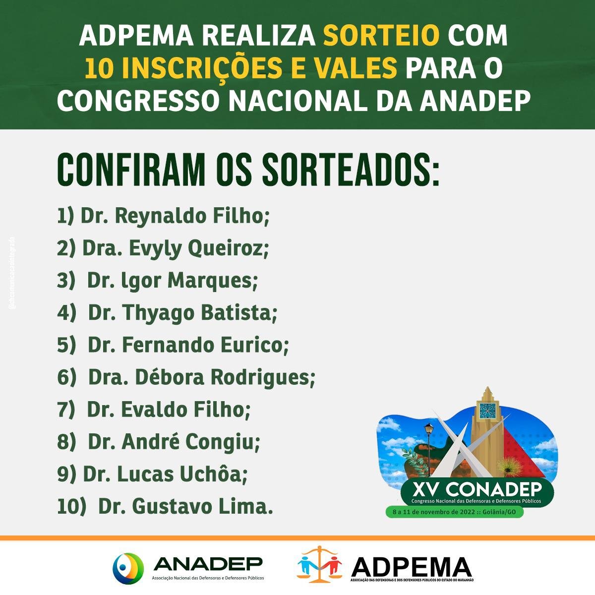 Foram sorteados os 10 participantes e 16 suplentes. A ADPEMA sorteou 10 inscrições com vale de R$1.200,00 cada uma para associadas e associados que se inscreveram.