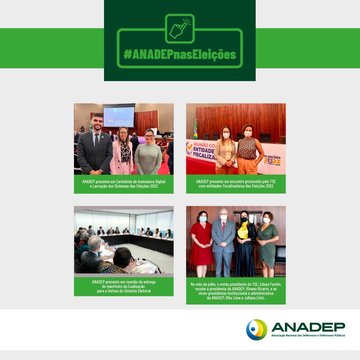 Em julho, após processo seletivo, o Tribunal anunciou o nome das oito entidades, entre elas a ANADEP, aptas para as Missões de Observação Eleitoral (MOEs). No mesmo mês, a presidenta, Rivana Ricarte, e as vice-presidentas, Rita Lima e Juliana Lintz, foram recebidas pelo então ministro Fachin para tratar do trabalho a ser realizado pela ANADEP durante às eleições.