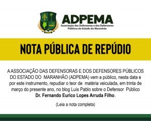 NOTA PÚBLICA DE REPÚDIO A ASSOCIAÇÃO DAS DEFENSORAS E DOS DEFENSORES PÚBLICOS DO ESTADO DOMARANHÃO (ADPEMA) vem a público, nesta data e por este instrumento, repudiar o teor dematéria Mais... 31 de março de 2023 Nenhum comentário